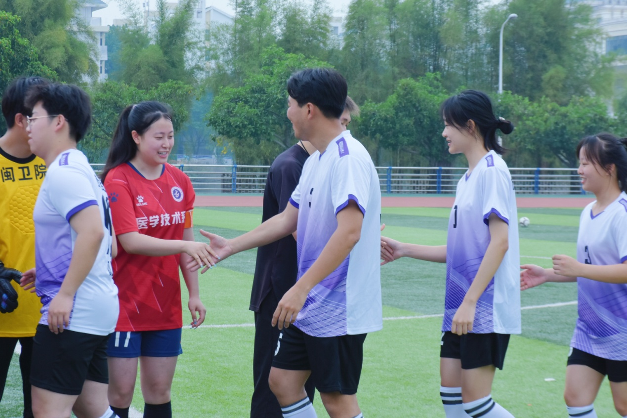 514日上午10:00"用足球激荡热血,让运动点亮青春"主题的足球友谊赛顺利开展,福建卫生职业技术学院医学技术系党总支书记柯琼莺,福建省肿瘤医院放疗班班主任陈超老师,以及校企双方老师、50名观众观看了比赛。