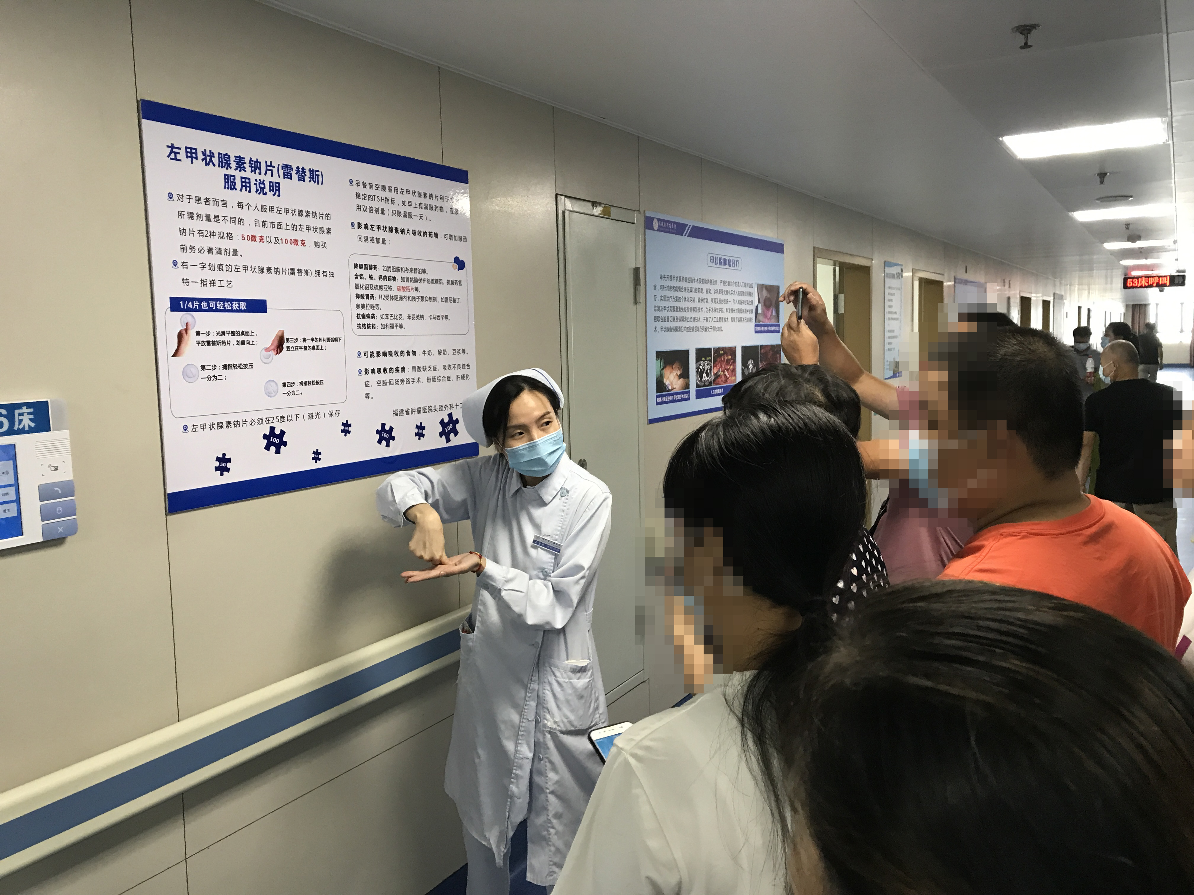为改进甲状腺肿瘤术后患者口服给药剂量的准确性,帮助解决患者精准服药的困扰,病区护士共同引用了一套“一指禅工艺”,并制作宣教图贴在病房的健康宣教长廊墙上,护士进行详细讲解,提高患者对服用左甲状腺素钠片剂量的准确性,同时给每个出院的甲状腺肿瘤的患者详细讲解左甲状腺素钠片药盒不同剂量标识的区别,患者们表示此举措有效地提高患者服药的准确性,保障了患者口服用药的安全,也提升了护理品质,得到患者、家属和医生的广泛好评及肯定。