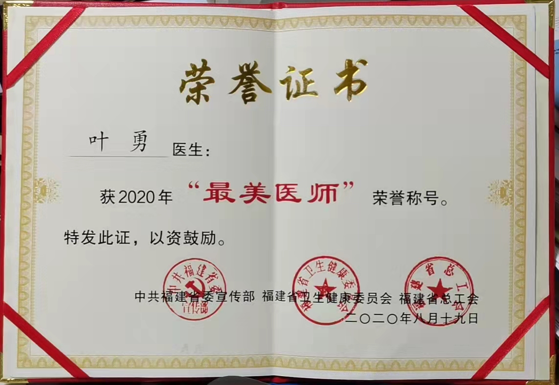因工作突出,近年来,叶勇先后获得“全省卫生健康系统先进工作者”“福建省最美医师”“白求恩式好医生”“福建医科大学优秀教师”“福建医科大学最美逆行者”“福建省肿瘤医院疫情防控青年先锋”等荣誉。