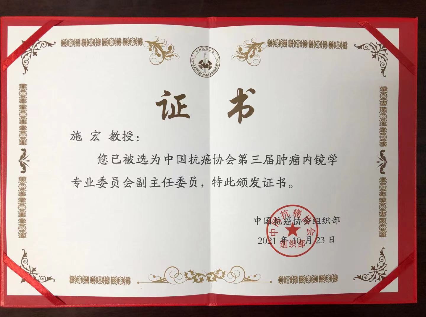 10月23日,中国抗癌协会肿瘤内镜学专业委员会全体会议在浙江杭州举行。会上,我院内镜中心主任施宏教授连任第三届委员会副主任委员,我院内镜中心黄贺副主任医师当选委员。