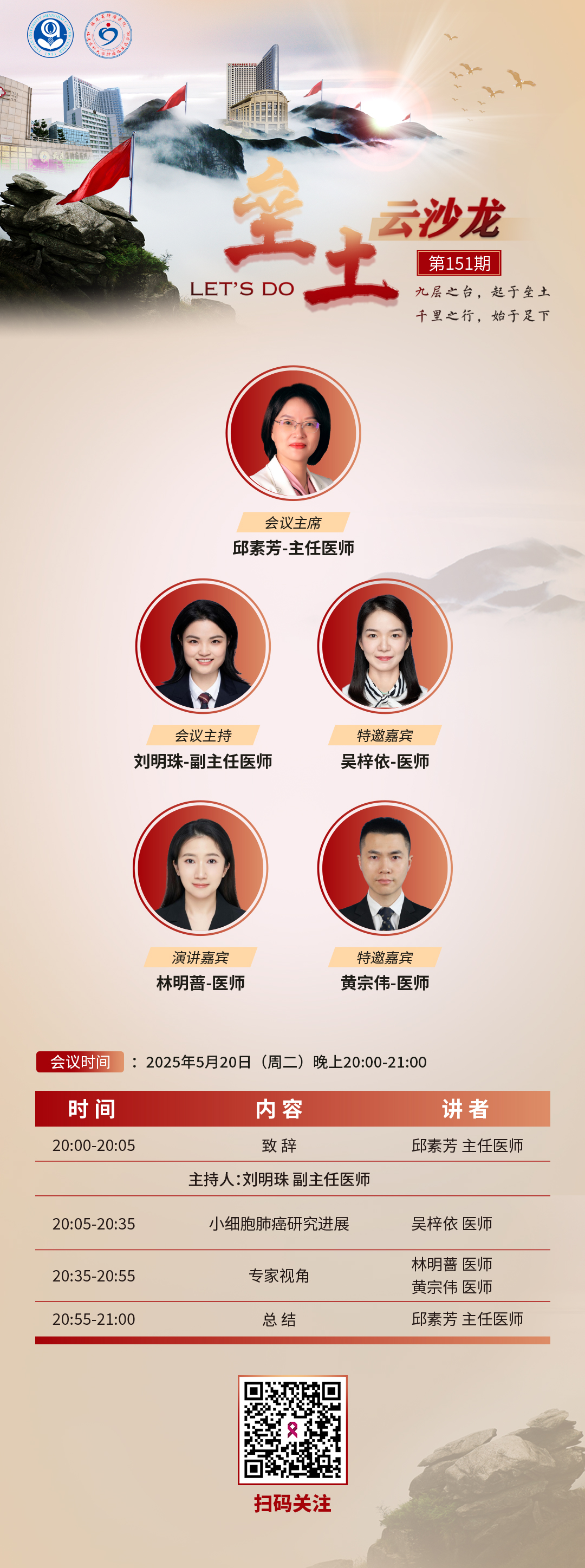 本期垒土沙龙(第151期)邀请到的嘉宾是福建省肿瘤医院放疗科的吴梓依医师,她将给我们带来主题为“小细胞肺癌研究进展”的精彩演讲。