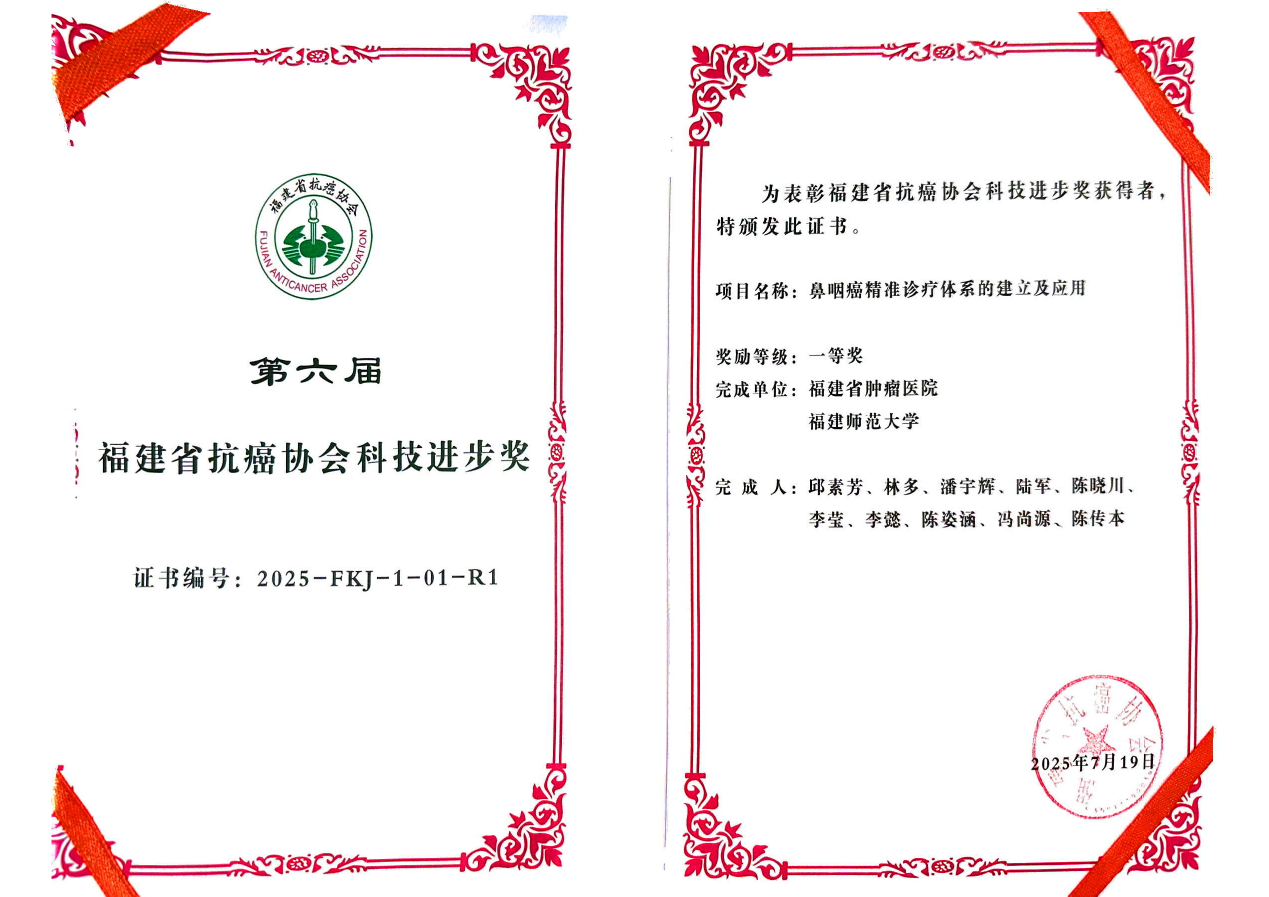 近日,我院鼻咽癌诊治中心邱素芳主任医师领衔的研究团队,联合福建师范大学林多教授团队共同开展的“鼻咽癌精准诊疗体系的建立及应用”项目,荣获第六届福建省抗癌协会科技进步奖一等奖。