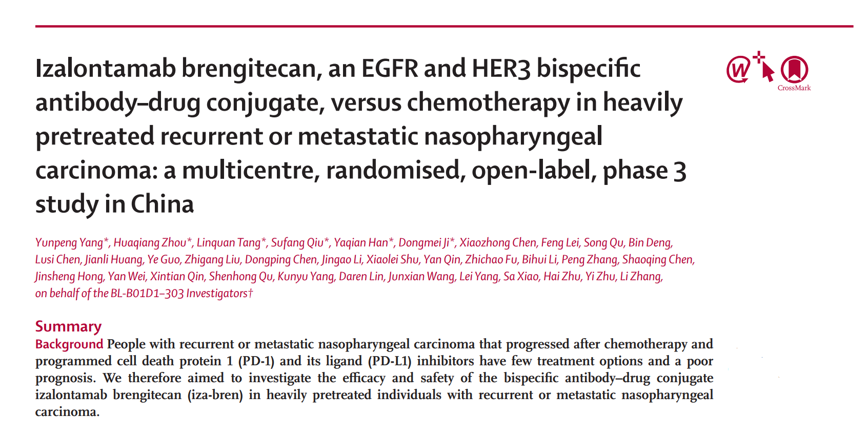 该研究是全球首个成功的确证性III期双抗ADC临床研究,验证了iza-bren这一创新药物的卓越疗效与可控的安全性。本研究登顶《柳叶刀》,标志着鼻咽癌治疗正式迈入“双抗ADC”新时代。我院邱素芳教授团队的深度参与,彰显了我院在肿瘤临床研究与创新疗法推动中的前沿地位。随着iza-bren的即将获批及后续应用,这一源自中国的全球首创疗法,将为更多晚期鼻咽癌患者带来生命新希望。
