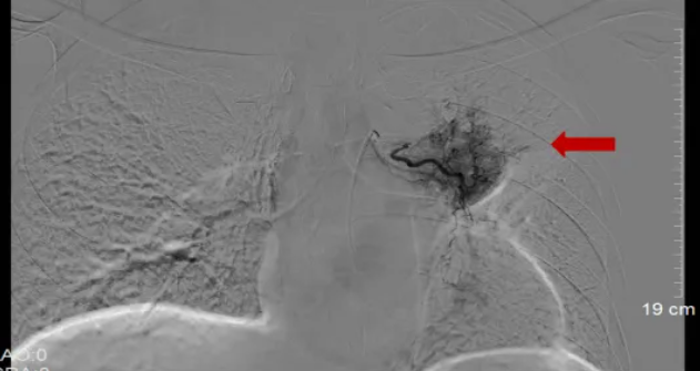 今年1月,患者出现活动后气促不适,来院复查胸部CT提示左上肺不张;支气管镜检查显示左肺上叶支气管增厚,活检病理提示肿瘤复发。患者为局部复发,相关检查未发现其他部位转移。鉴于左肺病灶已接受局部放疗,且放疗后1年内肿瘤复发,短期内无法再次行放疗。经我院胸部肿瘤内科与肿瘤与血管介入微创治疗中心医疗团队联合会诊评估后,为其制定了个体化治疗方案——实施经导管支气管动脉栓塞化疗术。