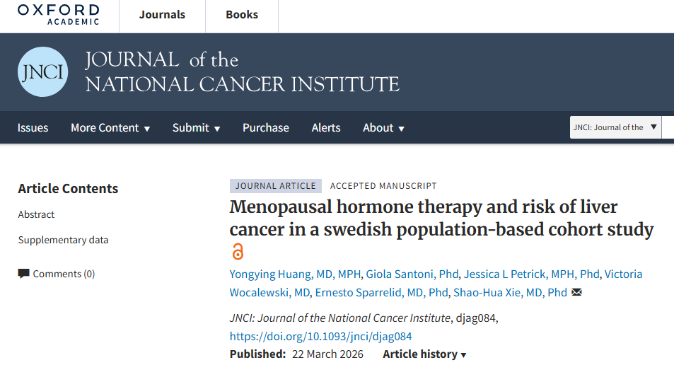 近日,我院黄永迎主管技师与美国、瑞典的国际同行共同完成的一项研究成果“Menopausal hormone therapy and risk of liver cancer in a Swedish population-based cohort study”(绝经期激素治疗与肝癌发病风险:一项基于瑞典人群的队列研究)在著名肿瘤学杂志JNCI(美国国立癌症研究院杂志,JCR Q1区,中科院1区)在线发表。