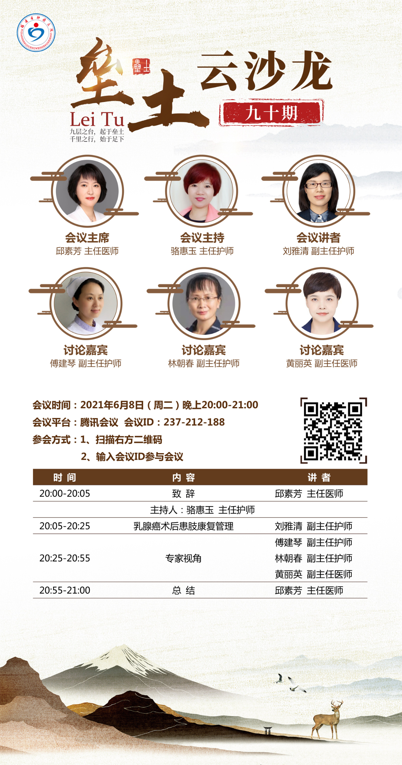 此外,我们有幸邀请到了福建省肿瘤医院护理部主任骆惠玉主任护师担任主持人,福建医科大学附属协和医院乳腺外科傅建琴护士长、福建省肿瘤医院乳腺内科林朝春护士长以及福建省肿瘤医院乳腺外科黄丽英副主任医师共同担任讨论嘉宾。各位专家将从内外科以及医护的不同角度出发,结合自己多年的工作经验,发表独到的见解。相信此次垒土沙龙活动定会是一场受益匪浅的经验交流,能够帮助我们更好的认识乳腺癌及其护理要点,从而更好地促进医护之间的沟通与交流。欢迎各位同仁认真聆听并踊跃参与!