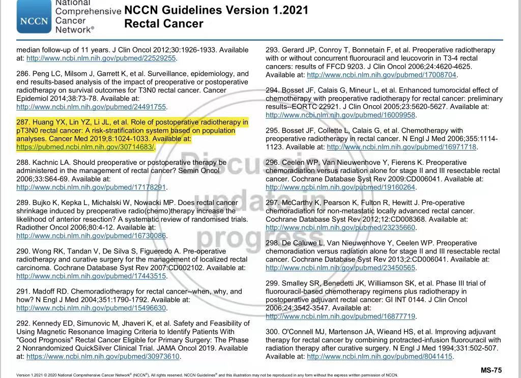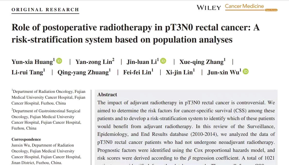 日前,在最新发表的美国NCCN直肠癌诊疗指南中,我院放疗科吴君心教授团队2019年发表的关于直肠癌的研究论文“Role of postoperative radiotherapy in pT3N0 rectal cancer: A risk‐stratification system based on population analyses ”被引用,论文的通讯作者为吴君心教授,李金銮教授、研究生黄云霞医师、林延宗医师为共同第一作者,张雪清、唐黎瑞、庄晴阳、林飞飞、林曦瑾等参加研究。