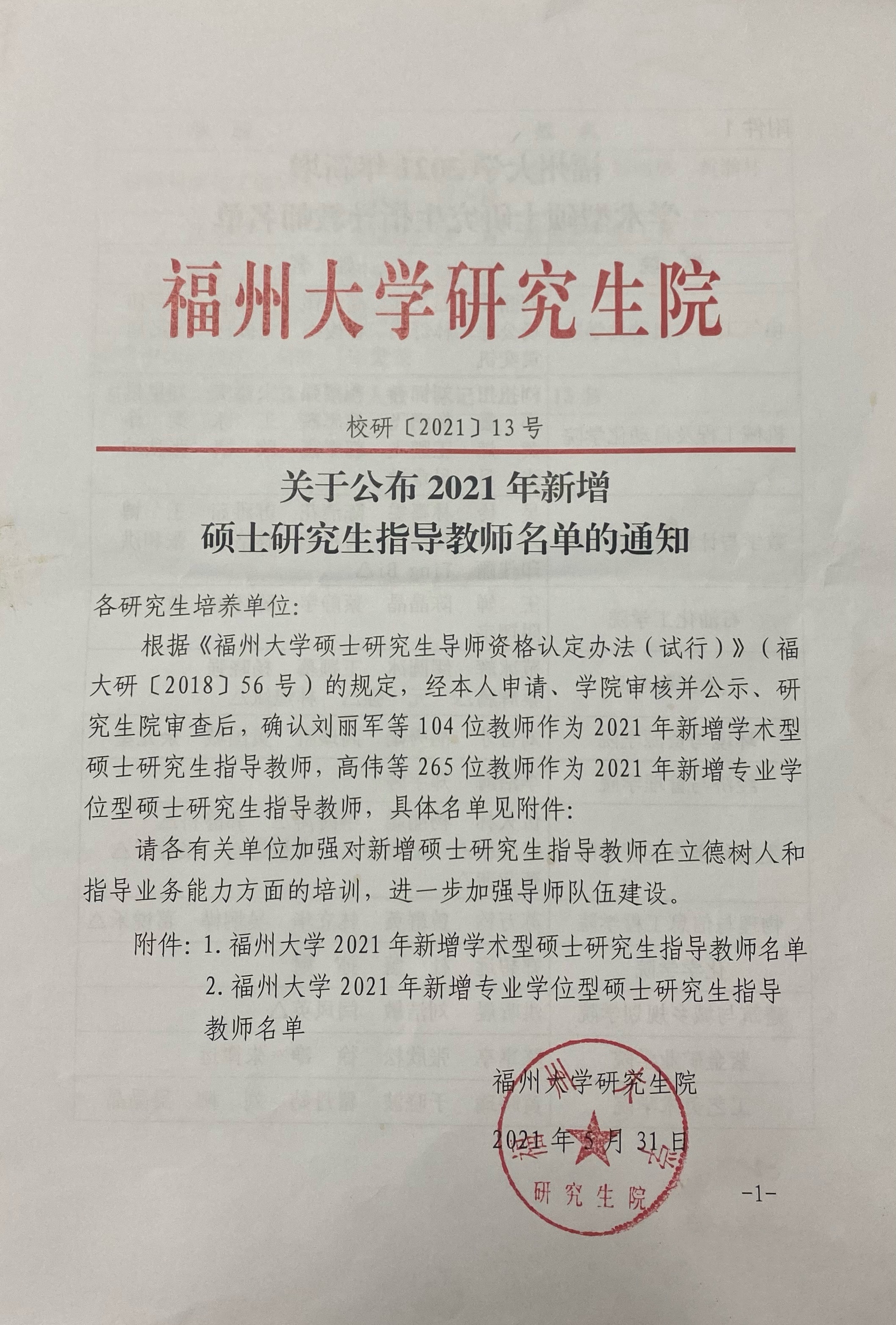 近日,福州大学研究生院公布2021年一批新增硕士研究生指导教师名单,我院17位同志榜上有名。目前,我院共有福州大学、福建医科大学、福建中医药大学等高校博导9人、硕导53名。