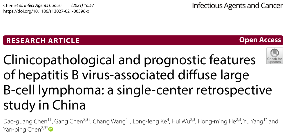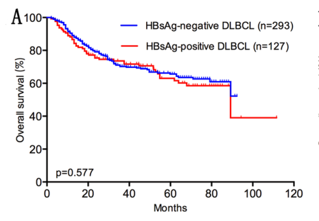 近日,我院淋巴瘤及头颈肿瘤内科陈道光医生等在国际医学期刊《Infect Agents Cancer》上发表了乙肝和淋巴瘤相关的研究,该研究通过分析10年间我院初治的420例弥漫大B细胞淋巴瘤临床病理特征、乙肝病毒携带情况及远期随访结果,发现本组弥漫大B细胞淋巴瘤乙肝病毒阳性的高达30%,并有一些独特的临床表现,既往认为伴有乙肝病毒感染的淋巴瘤预后较差,但本研究显示乙肝病毒感染并不影响预后,中位随访61.9月,尽管不到50%的病例合并使用利妥昔单抗,全组420例5年总生存仍高达63%。