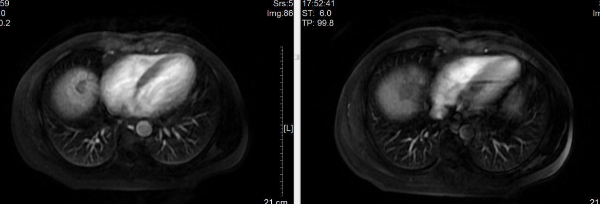 磁共振检查显示肿瘤位处肝脏膈顶部