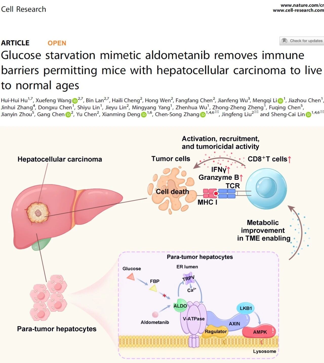 11月25日,我院刘景丰教授团队与厦门大学林圣彩院士团队共同解析“辟谷精”治疗肝细胞癌的应用前景与关键机制取得新进展,最新研究成果“Glucose starvation mimetic aldometanib removes immune barriers permitting mice with hepatocellular carcinoma to live to normal ages(辟谷精模拟葡萄糖饥饿效应,清除肝细胞癌小鼠免疫屏障,使之存活至正常寿命)”正式发表在国际权威期刊《Cell Research》(中科院一区TOP,IF: 25.9)。
