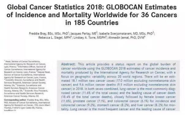近日,美国癌症学会官方期刊发表了《2018年全球癌症统计数据》报告,这篇文章评估了185个国家中的36种癌症发病率和死亡率。