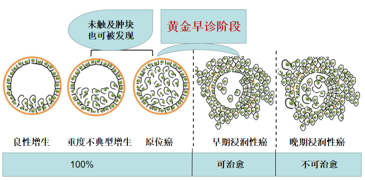 早期筛查是实现乳腺癌早诊早治,从而提高生存率的重要途径。前文中的小辰右乳肿块不痛不痒,没有引起重视,若有乳腺癌筛查的意识,能提前发现早期乳腺癌。其实,乳腺癌并不可怕,早期发现是治疗的关键!这些情况的发现并不困难,只要定期做好筛查,就能轻松发现!