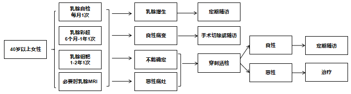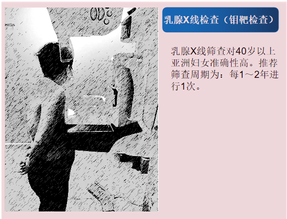 40~70岁:每1~2年进行1次乳腺X线检查。对致密型乳腺(乳腺X线检查提示腺体为c型或d型)推荐与B超检查联合。