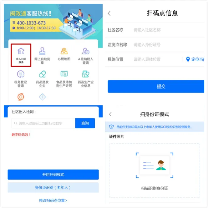 扫码人员以“法人用户”登录闽政通APP,进入“出入扫码服务”,开启扫码模式后,针对55周岁以上(含55周岁)人群可直接点击“身份证识别(老年人)”按钮,通过手机摄像头扫描老年人身份证人像面的方式,自动识别并获取用户身份信息,从而完成用户健康信息的检测。
