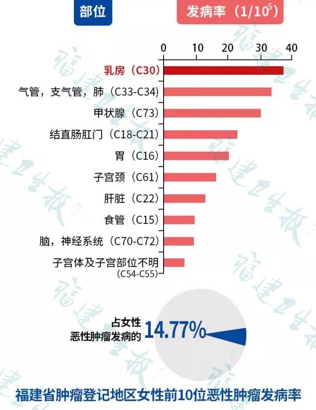 《年报》显示,2016年福建省肿瘤登记地区女性乳腺癌发病率为37/10万,占女性恶性肿瘤发病率的14.77%,居女性发病率第1位。