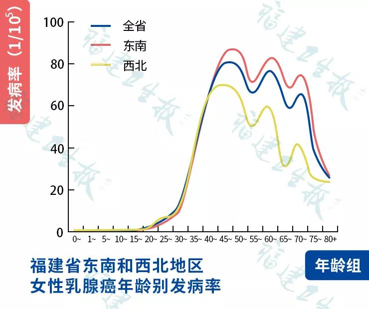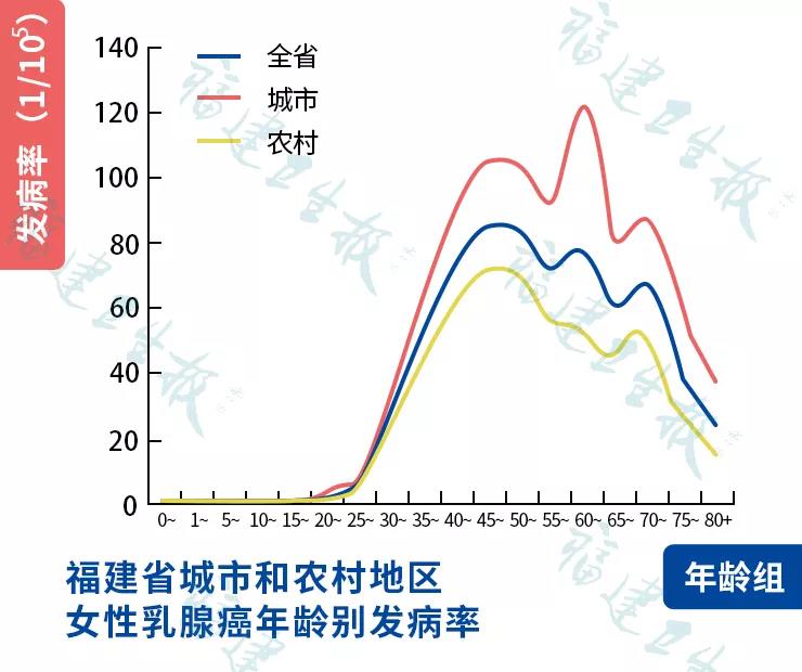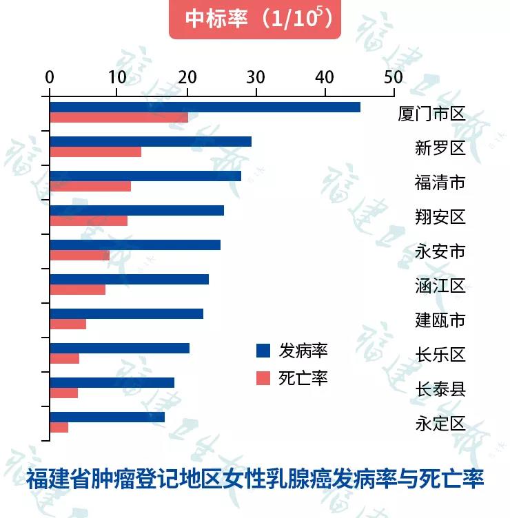 在全省10个肿瘤登记地区中,女性乳腺癌发病率最高的是厦门市区(45/10万),其次是龙岩新罗区和福清市。