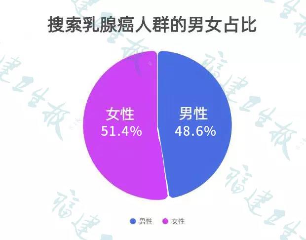 百度数据显示,搜索乳腺癌的人群男女占比相差不大,女性约占51.44%,男性约占48.56%。
