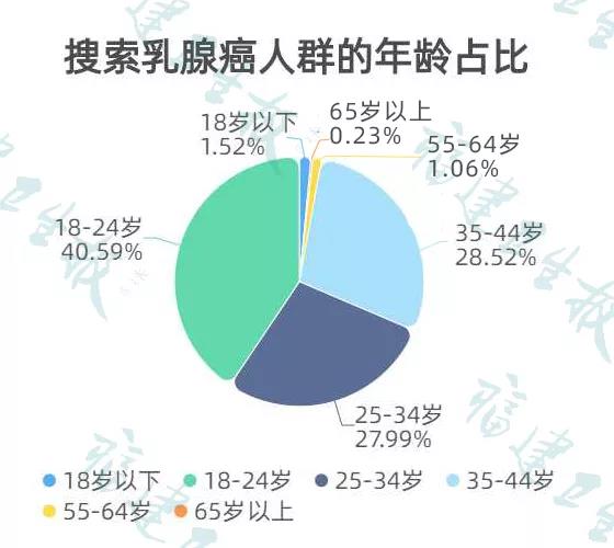 且与高发年龄段不同,18-24岁的人竟然最关注乳腺癌, 其次是 25-44岁人群。45岁后反而关注点降低,65岁以上仍然关注乳腺癌的人群仅占所有搜索人群的0.23%。
