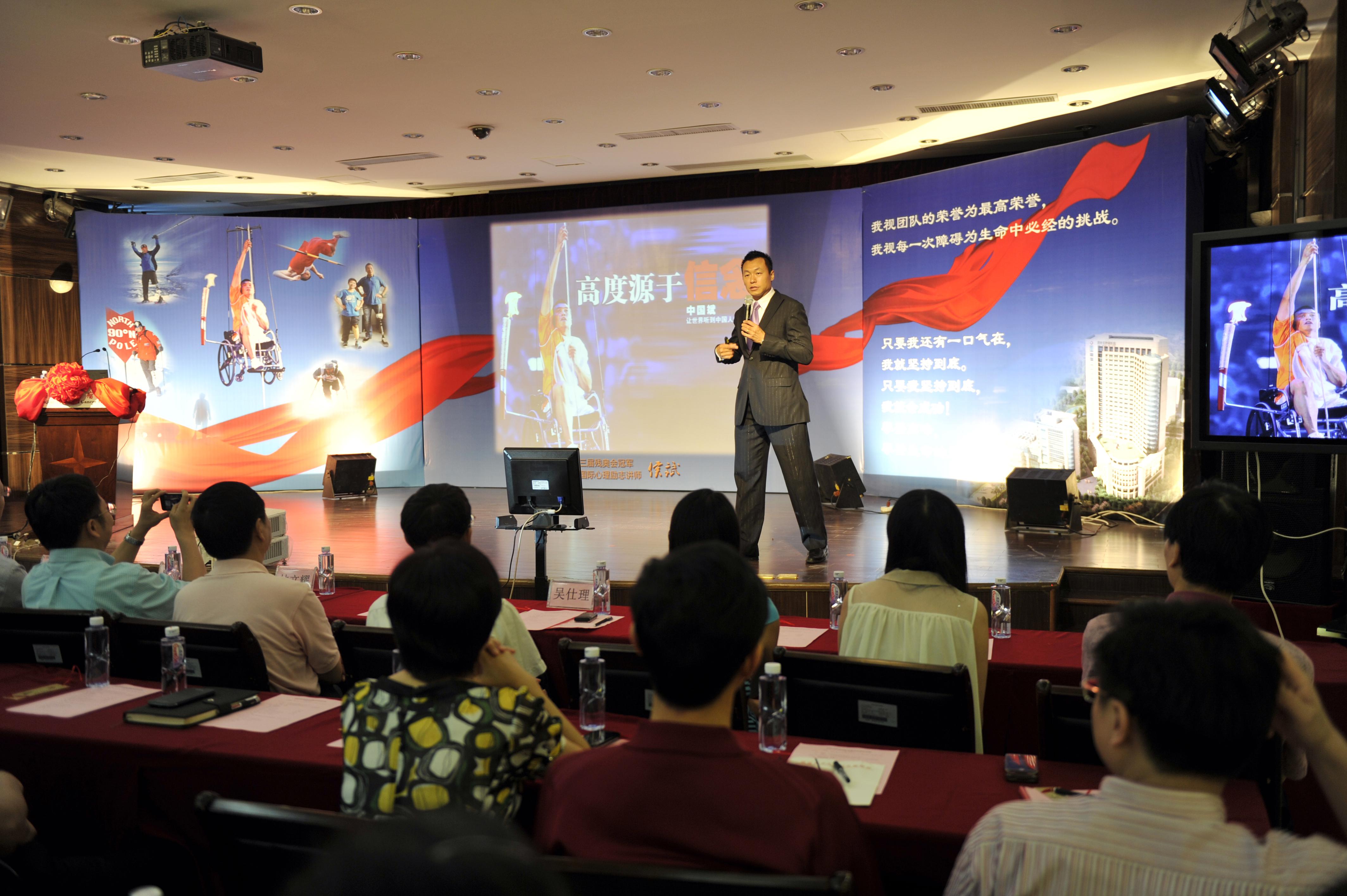 7月18日下午,福建省肿瘤医院举办一场别开生面的道德讲座。在《公民道德歌》的优美旋律伴奏下,医院大礼堂座无虚席,全球首位国际残奥形象大使、三届残奥会冠军、北京残奥会火炬手、国际心灵励志讲师侯斌围绕“高度源于信念”这个主题为医院干部职工带来了一场精彩的励志道德演讲,场面气氛热烈,掌声阵阵。