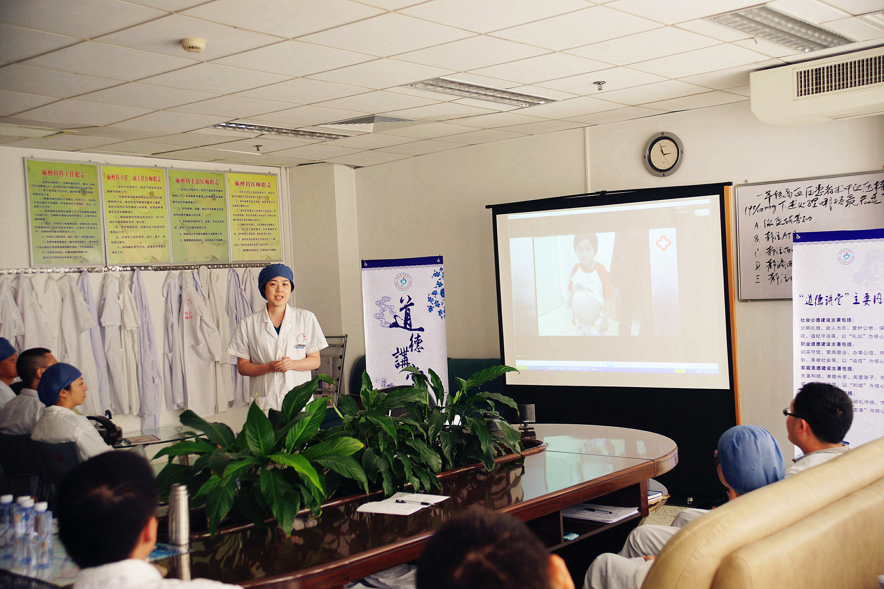 本期道德讲坛伴着清新的《公民道德歌》拉开了序幕,外科第三党支部杨明华书记以“让道德之花越开越鲜艳”为题,为大家开启一场别开生面的旅程,谈古论今,引经据典,从“程门立雪”的尊师重道,到“最美教师”的舍己救学生;从“虞舜孝亲”的爱孝仁义到“孝顺女孩孟佩洁”反哺切切;从“曾参杀猪”的守信遵义,到“杭州大巴司机”弥留之际仍心系乘客的负责重任……为我们描绘了一幅美好的道德画卷,我们应当追古思今,由小及大,立足本职工作,做到精益求精,一切为患者的利益而为。随后外科第三支部党员姚梦夏以演讲的形式,以“中国梦,健康梦,医疗梦”为主题,将5年前应敏刚院长为6岁小女孩成功切除腹部巨大肿瘤的事迹娓娓道来,以榜样的力量再次深刻了“道德、医德”这一主题。特别值得一提的是一个小插曲,在道德讲堂第五讲开讲的过程中,手术室收到了一个急诊手术申请,党员聂彬同志、林雅同志立即离开会场投入了紧张的临床工作中,以身践行社会主义道德、医德。