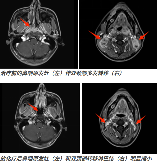 随后,刘先生转诊至我院鼻咽癌诊治中心,邱素芳主任医师团队为他展开全面检查:鼻咽部MRI显示,鼻咽恶性肿瘤已累及咽后间隙、翼内肌、枕骨斜坡等多处结构,双侧颈部及锁骨上还有多发淋巴结转移;活检病理确诊为非角化性未分化型癌,EB病毒DNA拷贝数也显著升高。经多学科专家会诊,他被明确诊断为鼻咽癌Ⅲ期(AJCC第九版),初步排除远处转移,为后续治疗留足了机会。