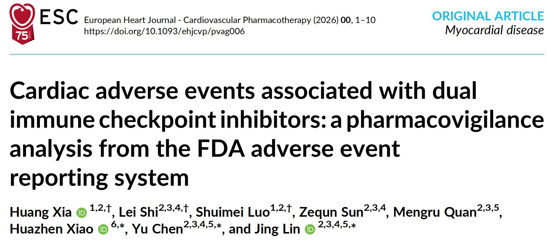 近日,我院黑色素瘤团队研究成果《Cardiac adverse events associated with dual immune checkpoint inhibitors: a pharmacovigilance analysis from the FDA adverse event reporting system(免疫检查点抑制剂治疗相关的心脏不良事件:来自FDA不良事件报告系统的药物警戒分析)》在心血管药理学领域高质量期刊《European Heart Journal – Cardiovascular Pharmacotherapy》(JCR Q1区,中科院2区)发表,夏煌住院医师为论文第一作者,林晶副主任医师、陈誉主任医师为共同通讯作者。