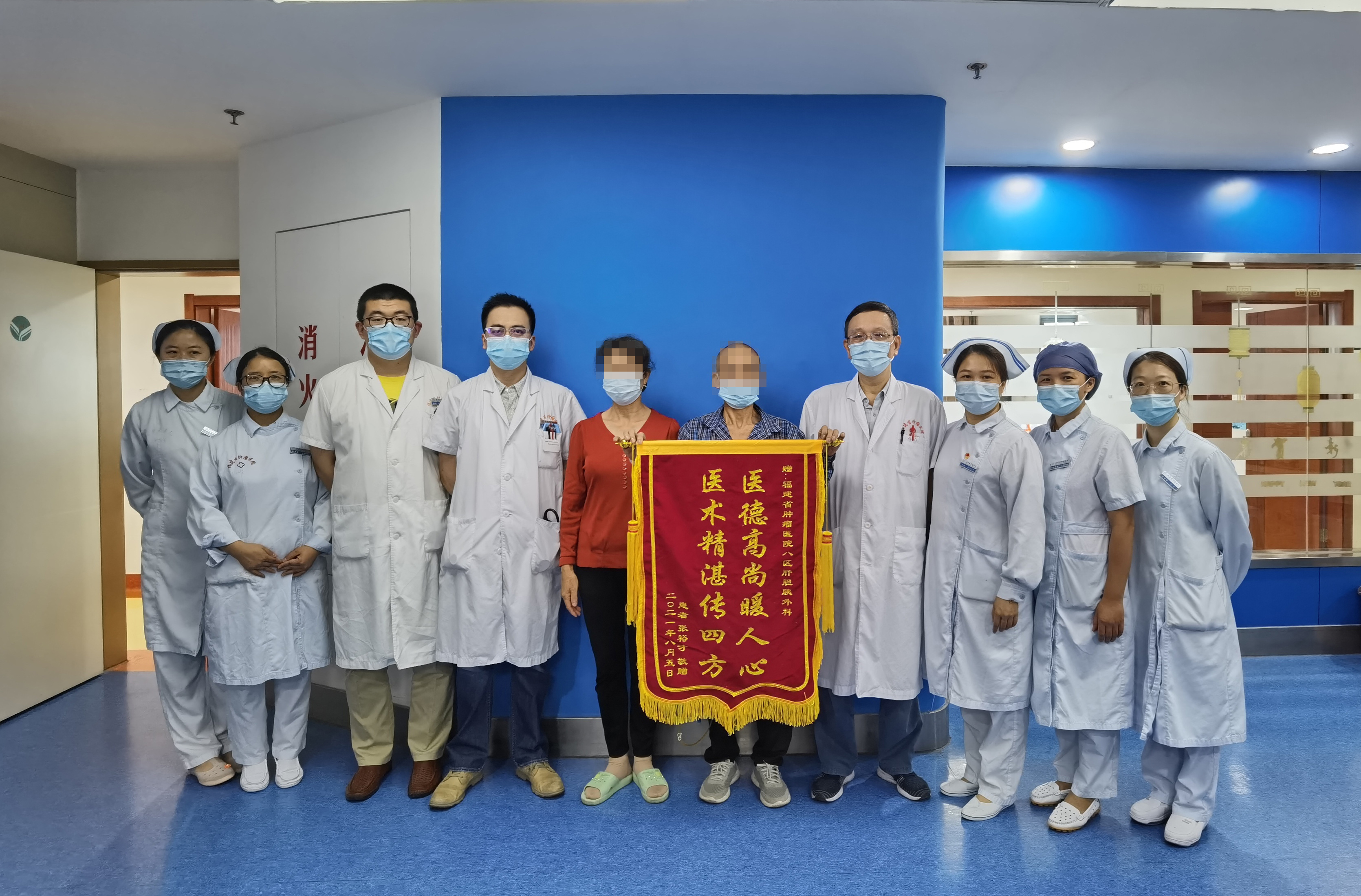 患者张**,胰十二指肠手术患者,住院期间,刚好碰到他的生日,老伴说今年特别想给他过个生日,但是因为疫情原因家人无法到场帮他庆祝,觉得有点遗憾。病区医护人员知晓后立即买了鲜花和蛋糕,在周东主任和王燕护士长带领下,利用微信视频跟家属一起为患者过了一个简单而温馨的生日。患者康复出院时,家属为医护人员送来了一面锦旗,表达了对八区医护团队的信任与感谢。