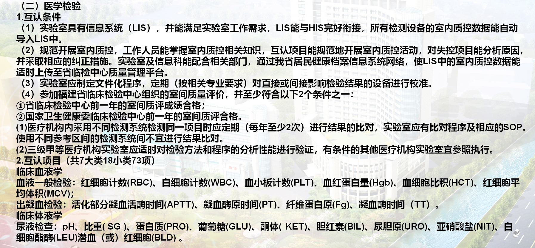 互认工作涵盖了检查检验结果互认范围、互认条件、互认项目等,省卫健委委托省临床检验中心和省放射诊断质量控制中心,优先将参加国家级、省级质控,稳定性好、质量能够监控、费用较高检查检验项目作为互认项目。目前,我院互认项目包括医学影像检查和医学检验10类128个细分项目,其中医学影像检查项目3类55项、临床检验项目7类73项,包括普通放射检查(10项)、CT检查(21项)、MRI检查(24项)、临床血液学、临床体液学、临床化学、临床免疫学、临床微生物学、红细胞血型、分子诊断等。