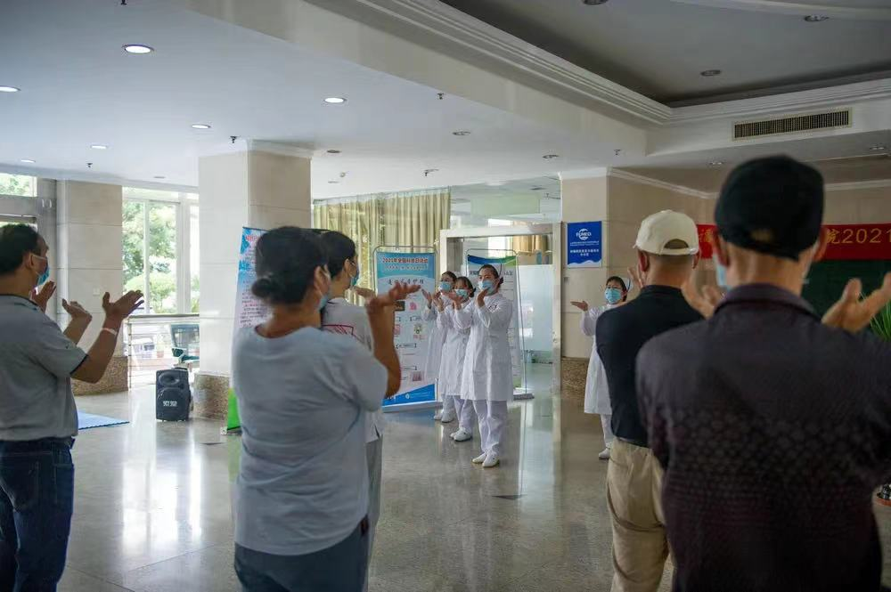 △护理人员带领患者和家属锻炼,舒缓不良情绪。