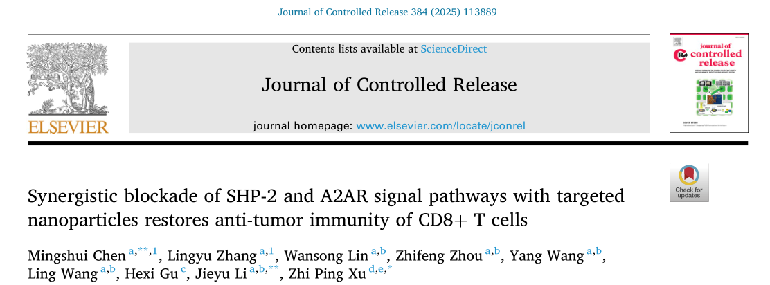 近日,我院肿瘤免疫学研究室暨肿瘤内科研究室在国际权威期刊《Journal of Controlled Release》(IF=10.5)发表研究成果《Synergistic blockade of SHP-2 and A2AR signal pathways with targeted nanoparticles restores antitumor immunity of CD8+ T cells(靶向性纳米微粒协同阻断SHP-2和A2AR信号通路恢复并增强CD8+ T细胞的抗肿瘤免疫效应)》。我院陈明水主任技师为第一作者及第一通讯作者,李洁羽副主任技师为共同通讯作者。
